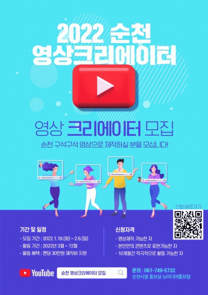 [¹Ìµð¾îÀü³² ÀÓ¼º¿Ï ±âÀÚ] ¼øÃµ½Ã´Â ¿µ»ó âÀÛÀ» ÅëÇØ ¼øÃµÀÇ ´Ù¾çÇÏ°í »ý»ýÇÑ ¼Ò½ÄÀ» ÀüÇÒ ¡®2022 ¼øÃµ ¿µ»óÅ©¸®¿¡ÀÌÅÍ¡¯¸¦ ¿À´Â 2¿ù 6ÀϱîÁö ¸ðÁýÇÑ´Ù. ¼øÃµ ¿µ»óÅ©¸®¿¡ÀÌÅÍ´Â 3¿ùºÎÅÍ 12¿ù±îÁö ¸Å¿ù ½ÃÁ¤¼Ò½Ä, Çà»ç¡¤ÃàÁ¦, °ü±¤Áö¡¤¸À¡¦