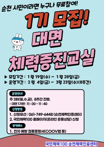 [¹Ìµð¾îÀü³² ÀÓ¼º¿Ï ±âÀÚ] ¼øÃµ½Ã´Â ¿À´Â 28ÀϱîÁö ¼øÃµÃ¼·ÂÀÎÁõ¼¾ÅÍ ¡®´ë¸é ü·ÂÁõÁø±³½Ç¡¯ Á¦1±â Âü°¡ÀÚ¸¦ ¸ðÁýÇÑ´Ù. À̹ø 1±â ´ë¸é ü·ÂÁõÁø±³½ÇÀº 2¿ù 4ÀϺÎÅÍ 3¿ù 23ÀϱîÁö 8ÁÖ°£, ÁÖ3ȸ ¿ÀÀü 11½Ã¿¡ ½ÃÀÛÇØ 40ºÐ µ¿¾È ÁøÇàµÈ´Ù. ¡¦