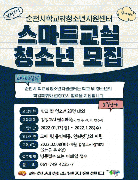 [¹Ìµð¾îÀü³² ÀÓ¼º¿Ï ±âÀÚ] ¼øÃµ½Ã´Â Çб³ ¹Û û¼Ò³âÀÇ 2022³â Á¦1ȸ °ËÁ¤°í½Ã ´ëºñ¸¦ À§ÇØ ¿À´Â 28ÀϱîÁö ½º¸¶Æ®±³½Ç Âü°¡ û¼Ò³âÀ» ¸ðÁýÇÑ´Ù. Âü¿©´ë»óÀº °ËÁ¤°í½Ã¸¦ ÁغñÇÏ´Â 14¼¼~24¼¼ û¼Ò³âÀ¸·Î 2¿ù 8ÀÏ ½ÃÀÛÇØ 4¿ù 8ÀϱîÁö ÁÖ 4ȸ¡¦