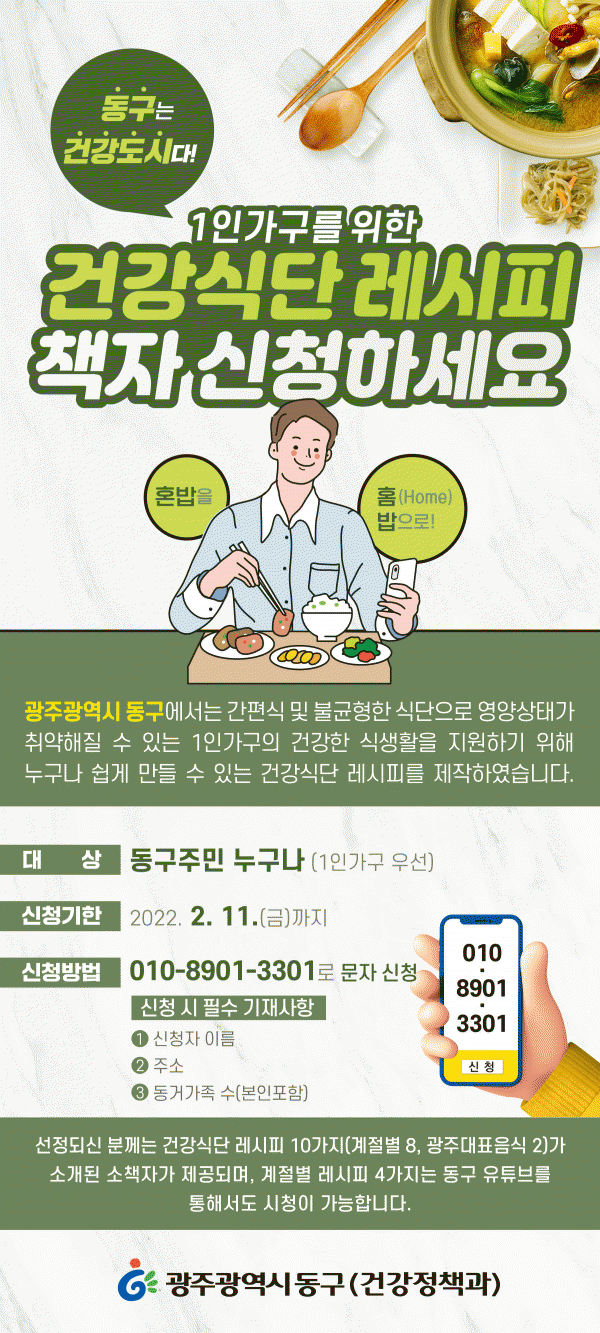 [¹Ìµð¾îÀü³² ±èÁ¤¿ì ±âÀÚ] ±¤ÁÖ µ¿±¸´Â 1ÀÎ °¡±¸ÀÇ °Ç° ½Ä»ýȰÀ» Áö¿øÇϱâ À§ÇØ ¡®1ÀÎ °¡±¸¸¦ À§ÇÑ °Ç°½Ä´Ü ·¹½ÃÇÇ¡¯¸¦ °³¹ßÇØ Ã¥ÀÚ¿Í µ¿¿µ»óÀ¸·Î Á¦ÀÛÇß´Ù°í ¹àÇû´Ù. ÀÌ Ã¥ÀÚ´Â 1ÀÎ °¡±¸ Áõ°¡¿Í Äڷγª19·Î ÀÎÇØ °£Æí½ÄÀ̳ª ¹è´Þ À½½Ä¡¦