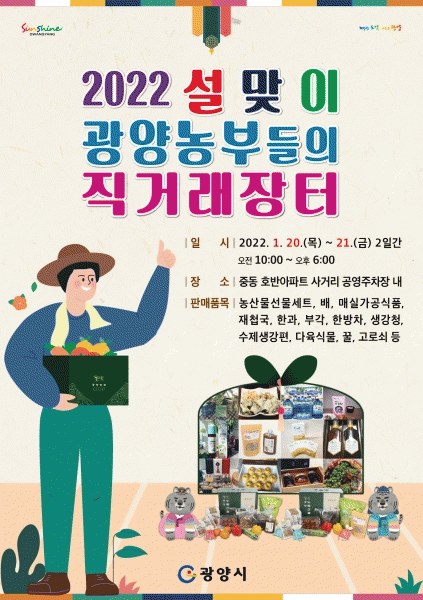 [¹Ìµð¾îÀü³² ÀÓ¼º¿Ï ±âÀÚ] ±¤¾ç½Ã´Â 2022³â ¼³¸íÀýÀ» ¸Â¾Æ ¿À´Â 1¿ù 20ÀϺÎÅÍ ÀÌÆ²°£ ±¤¾ç¿¡¼ »ý»êµÇ´Â ¿ì¼ö ³óƯ»ê¹°À» ¾ÈÀüÇÏ°Ô ±¸ÀÔÇÒ ¼ö ÀÖ´Â ¡®¼³¸ÂÀÌ ±¤¾ç³óºÎµéÀÇ Á÷°Å·¡ÀåÅÍ¡¯¸¦ ¿î¿µÇÑ´Ù. À̹ø ÀåÅÍ´Â Á߸¶µ¿ È£¹Ý¾ÆÆÄÆ® »ç¡¦