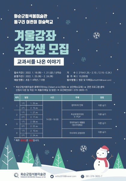 [¹Ìµð¾îÀü³² Á¦°¥´ëÁ¾ ±âÀÚ] ȼø±º¸³¼®ºÀ¹Ì¼ú°üÀÌ 2022³â µ¿±¸¸® ¾î¸°ÀÌ ¹Ì¼úÇб³¿Í ¹Ì¼ú±³½ÇÀ» 1¿ù 25ÀϺÎÅÍ 2¿ù 24ÀϱîÁö ¿î¿µÇÑ´Ù. ȼø±ºÀº ÇÁ·Î±×·¥¿¡ Âü¿©ÇÒ ¼ö°»ýÀ» 1¿ù 18ÀϺÎÅÍ 23ÀϱîÁö ¸ðÁýÇÑ´Ù°í ¹àÇû´Ù. ½Åû¼´Â ȼø±º¡¦