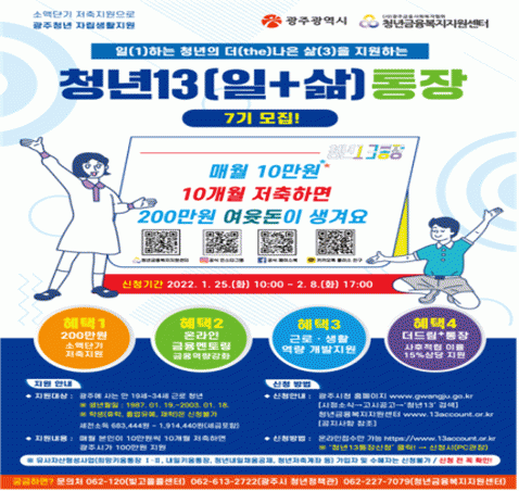 [¹Ìµð¾îÀü³² Á¦°¥´ëÁ¾ ±âÀÚ] ±¤ÁÖ±¤¿ª½Ã´Â ÀÏÇϴ û³âÀÇ °æÁ¦Àû ÀÚ¸³°ú »ýȰ¾ÈÁ¤À» Áö¿øÇÏ´Â ¡®Ã»³â13ÅëÀ塯 7±â Âü¿©ÀÚ 500¸íÀ» ¸ðÁýÇÑ´Ù. ¡®Ã»³â13ÅëÀ塯Àº ¿ù 10¸¸¿ø¾¿ 10°³¿ù°£ ÀúÃàÇÏ¸é¼ ±ÝÀ¶¿ª·®°È ÇÁ·Î±×·¥¿¡ Âü¿©ÇÑ Ã»³âµé¿¡¡¦