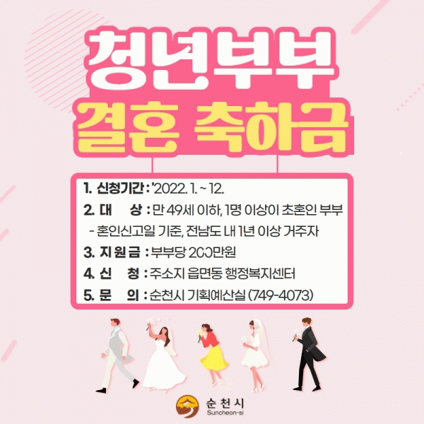 [¹Ìµð¾îÀü³² ÀÓ¼º¿Ï ±âÀÚ] ¼øÃµ½Ã´Â û³âÃþ °áÈ¥ Àå·Á ¹× ¾ÈÁ¤ÀûÀÎ Á¤Âø Áö¿øÀ» À§ÇØ À۳⿡ ÀÌ¾î ¿ÃÇØµµ û³âºÎºÎ °áÈ¥ÃàÇÏ±Ý 200¸¸¿øÀ» Áö¿øÇÑ´Ù. ½Åû ÀÚ°ÝÀº 2021³â 1¿ù 1ÀÏ ÀÌÈÄ È¥ÀνŰíÇÑ ºÎºÎ·Î ³²³à ¸ðµÎ ¸¸49¼¼ ÀÌÇÏÀÌ¸ç ºÎºÎ¡¦