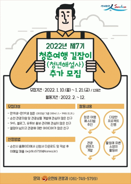 [¹Ìµð¾îÀü³² ÀÓ¼º¿Ï ±âÀÚ] ¼øÃµ½Ã´Â û³âÀÇ ´«³ôÀÌ¿Í Æ®·»µå¿¡ ¸ÂÃá ü·ùÇü °ü±¤°´ À¯Ä¡ ¹× °ü±¤ È«º¸ ¸¶ÄÉÆÃ µî ´Ù¾çÇÑ È°µ¿À» ÇÒ ¼ö Àִ ûÃá¿©Çà±æÀâÀ̸¦ ¸ðÁýÇÑ´Ù. 2016³â óÀ½ Ãâ¹üÇÑ Ã»Ãá¿©Çà±æÀâÀÌ´Â Áö³ 6³â°£ ³»ÀÏ·¯¿Í ûÃá¿©¡¦