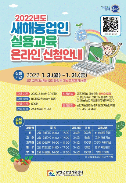 [¹Ìµð¾îÀü³² ±èÆÇ±¹ ±âÀÚ] ¹«¾È±ºÀº ¿À´Â 2¿ù 8ÀϺÎÅÍ 14ÀϱîÁö 2022³â »õÇØ ³ó¾÷ÀÎ ½Ç¿ë±³À°À» ºñ´ë¸é ¹æ½ÄÀ¸·Î ½Ç½ÃÇÑ´Ù°í ¹àÇû´Ù. »õÇØ ³ó¾÷ÀÎ ½Ç¿ë±³À°Àº ³ó¾÷ÀÎÀÇ ÇÑÇØ ¿µ³ó°èȹ ¼ö¸³À» À§ÇØ ÀÛ¸ñº° ÃֽŠ¿¬±¸ ³ó¾÷±â¼ú°ú ÇÙ½É ¿µ³ó¡¦