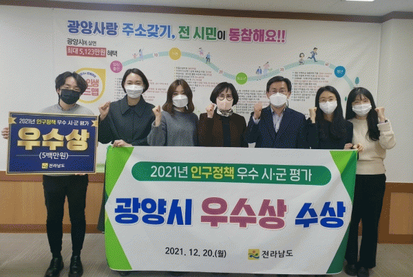 [¹Ìµð¾îÀü³² ÀÓ¼º¿Ï ±âÀÚ] ±¤¾ç½Ã°¡ Àü·ÂÅõ±¸Çϸç ÁøÇàÇØ¿Â 'Àα¸Á¤Ã¥¡®ÀÌ ´ë³»¡¤¿ÜÀûÀ¸·Î ÁÁÀº ¹ÝÀÀ°ú Æò°¡¸¦ ¹Þ°í ÀÖ´Ù. 12¿ù 20ÀÏ Àü¶ó³²µµ ÁÖ°ü ¡®2021³âµµ Àα¸Á¤Ã¥ ¿ì¼ö ½Ã±º Æò°¡¡¯¿¡¼ ±¤¾ç½Ã´Â ¡®¿ì¼ö»ó¡¯°ú ½Ã»ó±Ý 5¹é¸¸¿øÀ»¡¦