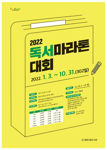 [¹Ìµð¾îÀü³² ÀÓ¼º¿Ï ±âÀÚ] ±¤¾ç½Ã¸³µµ¼°üÀº Áö¿ª»çȸ¿¡ Ã¥ Àд ¹®È¸¦ È®»êÇϱâ À§ÇØ ³»³â 1¿ù 3ÀÏ~10¿ù 31ÀÏ 2022³â µ¶¼¸¶¶óÅæ ´ëȸ¸¦ °³ÃÖÇÑ´Ù. µ¶¼¸¶¶óÅæ ´ëȸ´Â Ã¥ 1ÂÊÀ» ¸¶¶óÅæ 1m·Î ȯ»êÇØ ²ÙÁØÈ÷ Ã¥À» ÀÐ°í ¹Ì¸® ¼³Á¤ÇÑ µ¶¼¡¦