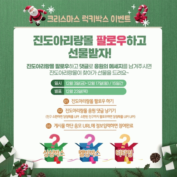 [¹Ìµð¾îÀü³² Á¦°¥´ëÁ¾ ±âÀÚ] Áøµµ¾Æ¸®¶û¸ôÀÌ Å©¸®½º¸¶½º¸¦ ¸Â¾Æ SNS À̺¥Æ®¸¦ ½Ç½ÃÇϰí ÀÖ´Ù. Âü¿© ¹æ¹ýÀº Áøµµ¾Æ¸®¶û¸ô SNS ÆÈ·Î¿ì ÈÄ ´ñ±Û·Î ÀÀ¿øÀÇ ¸Þ½ÃÁö¸¦ ³²±â¸é µÈ´Ù. Ä£±¸¸¦ ¼ÒȯÇÏ°í ¼ÒȯµÈ Ä£±¸±îÁö ÆÈ·Î¿ì¸¦ ¿Ï·áÇÏ¸é ´ç÷¡¦