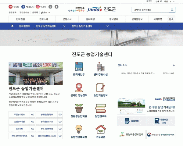 [¹Ìµð¾îÀü³² Á¦°¥´ëÁ¾ ±âÀÚ] Áøµµ±ºÀÌ ³ó¾÷ °ü·Ã Á¤º¸ÀÇ ÇàÁ¤¼ºñ½º Á¢±Ù¼º Çâ»ó°ú ¼ÒÅëÀ» À§ÇØ Áøµµ±º³ó¾÷±â¼ú¼¾ÅÍ È¨ÆäÀÌÁö¸¦ Àü¸é °³ÆíÇß´Ù. »õ·Ó°Ô °³ÆíµÈ ȨÆäÀÌÁö´Â ³ó¾÷±â¼ú¼¾ÅÍ¿¡¼ ÃßÁøÇϰí ÀÖ´Â °¢Á¾ º¸Á¶»ç¾÷, ½Ã¹ü»ç¾÷, ±³À°¡¦