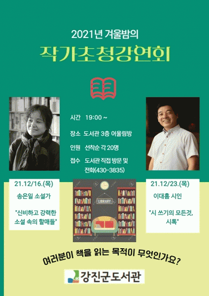 [¹Ìµð¾îÀü³² Á¦°¥´ëÁ¾ ±âÀÚ] °Áø±ºµµ¼°üÀÌ ÀÛ°¡¸¦ Á÷Á¢ ¸¸³ª Ã¥¿¡ ´ëÇÑ ÀÌÇØ¸¦ ³ôÀ̰í Ã¥ Àд ¹®È È®»êÀ» À§ÇØ ¿À´Â 16ÀÏ 23ÀÏ Àú³á 7½Ã¿¡ ¡®2021³âµµ °Ü¿ï¹ãÀÇ ÀÛ°¡ÃÊû°¿¬È¸¡¯¸¦ °³ÃÖÇÑ´Ù. °¿¬È¸´Â 16ÀÏ¿¡ ¼ÛÀºÀÏ ÀÛ°¡ÀÇ ¡®½Åºñ¡¦
