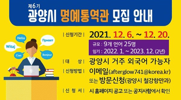 [¹Ìµð¾îÀü³² ÀÓ¼º¿Ï ±âÀÚ] ±¤¾ç½Ã´Â ±¹Á¦È ÁõÁø¿¡ Áß¿äÇÑ ¿ªÇÒÀ» ´ã´çÇÒ ¡®Á¦6±â ±¤¾ç½Ã ¿Ü±¹¾î ¸í¿¹Å뿪°ü¡¯À» ¿À´Â 12¿ù 20ÀϱîÁö ¸ðÁýÇÑ´Ù. ¸ðÁýÀοøÀº 9°³ ¾ð¾î 25¸íÀ¸·Î ¿Ü±¹¾î ´É·ÂÀÌ ¶Ù¾î³ ±¤¾ç½Ã¹ÎÀ» ´ë»óÀ¸·Î ¸ðÁý¡¤¼±¹ßÇÒ ¿¹¡¦