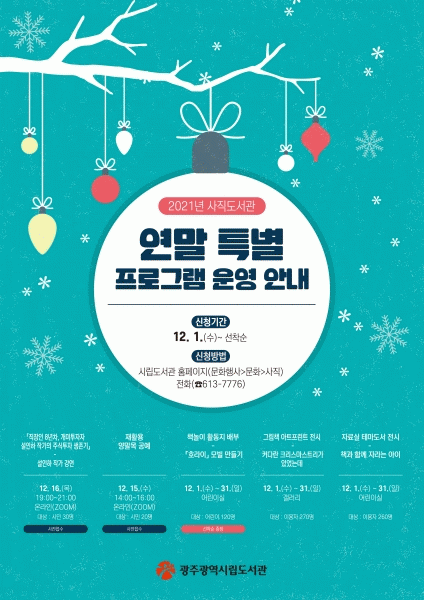 [¹Ìµð¾îÀü³² Á¦°¥´ëÁ¾ ±âÀÚ] ±¤ÁÖ±¤¿ª½Ã¸³µµ¼°üÀº »çÁ÷µµ¼°ü¿¡¼ 12¿ù ÇÑ´Þ°£ µ¶¼¿Í °ü·ÃµÈ ¿¬¸» Ưº° ÇÁ·Î±×·¥À» ´ë¸é°ú ºñ´ë¸éÀ¸·Î ¿î¿µÇÑ´Ù. ¸ÕÀú ¿Â¶óÀÎÀ¸·Î´Â ÁÜÀ» ÅëÇØ 15ÀÏ¿¡´Â ¾ç¸»À» ¸¸µé°í ³²Àº ÀÚÅõ¸®ÃµÀ» ÀçȰ¿ëÇØ ¹Ù±¸´Ï¡¦