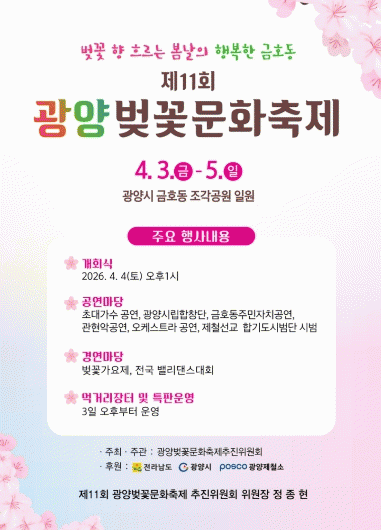 [¹Ìµð¾îÀü³² ÀÓ¼º¿Ï ±âÀÚ]±¤¾ç½Ã ±ÝÈ£µ¿Àº ¿À´Â 4¿ù 3ÀϺÎÅÍ 4¿ù 5ÀϱîÁö ±ÝÈ£µ¿ Á¶°¢°ø¿ø ÀÏ¿ø¿¡¼ 3Àϰ£ Á¦11ȸ ±¤¾çº¢²É¹®ÈÃàÁ¦¸¦ °³ÃÖÇÑ´Ù°í ¹àÇû´Ù. ¿ÃÇØ·Î 11ȸ¸¦ ¸ÂÀÌÇÏ´Â À̹ø ÃàÁ¦´Â ¡°º¢²ÉÇâ È帣´Â º½³¯ÀÇ ÇູÇÑ ±ÝÈ£µ¿¡±¡¦