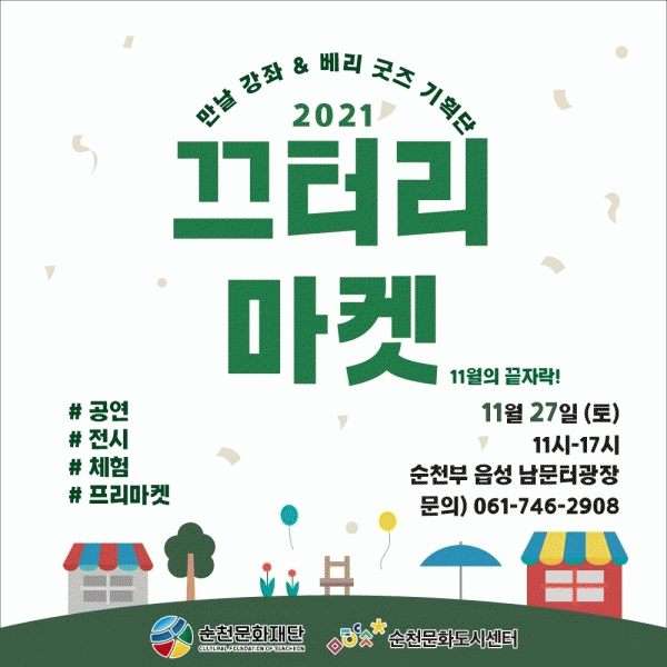 [¹Ìµð¾îÀü³² ÀÓ¼º¿Ï ±âÀÚ] ¼øÃµ¹®ÈÀç´ÜÀº ¿À´Â 27ÀÏ ¿ÀÀü 11½ÃºÎÅÍ ¿ÀÈÄ 5½Ã±îÁö ¼øÃµºÎ À¾¼º ³²¹®ÅÍ ±¤Àå¿¡¼ ¡®2021 ²ôÅ͸® ¸¶ÄÏ¡¯Çà»ç¸¦ °³ÃÖÇÑ´Ù. À̹ø Çà»ç´Â 2021³â ¿µµ¿1¹øÁö »ýȰ¹®ÈÇÁ·Î±×·¥ÀÎ ¡®¸¸³¯°Á¡¯ °»ç¿Í ¼ö°»ýµéÀÌ¡¦