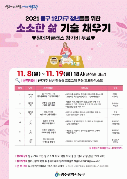 [¹Ìµð¾îÀü³² ±èÁ¤¿ì ±âÀÚ] ±¤ÁÖ µ¿±¸´Â 1ÀÎ °¡±¸ û³âµéÀÇ ÀÏ»ó»ýȰ ±â´É Çâ»ó°ú »çȸ Âü¿© ÁõÁøÀ» ÅëÇÑ »îÀÇ Áú Çâ»óÀ» À§ÇÑ ¡®¼Ò¼ÒÇÑ »î ±â¼ú ä¿ì±â¡¯ Âü¿©ÀÚ¸¦ ¿À´Â 19ÀϱîÁö ¸ðÁýÇÑ´Ù°í ¹àÇû´Ù. ¿ÃÇØ ÁÖ¹ÎÂü¿©¿¹»ê»ç¾÷À¸·Î ¼±Á¤µÈ ¡¦