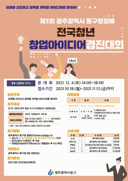 [¹Ìµð¾îÀü³² ±èÁ¤¿ì ±âÀÚ] ±¤ÁÖ µ¿±¸´Â ¿À´Â 12¿ù 4ÀÏ Àü±¹ û³âµéÀ» ´ë»óÀ¸·Î ¡®Á¦3ȸ ±¤ÁÖ±¤¿ª½Ã µ¿±¸Ã»Àå¹è Àü±¹ û³ââ¾÷ ¾ÆÀ̵ð¾î °æÁø´ëȸ¡¯¸¦ °³ÃÖÇÑ´Ù°í ¹àÇû´Ù. ¿ÃÇØ·Î 3ȸ°¸¦ ¸Â´Â °æÁø´ëȸ´Â ¡®¹Ì·¡¸¦ ¼±µµÇÏ°í °ñ¸ñÀ» °³Ã´¡¦