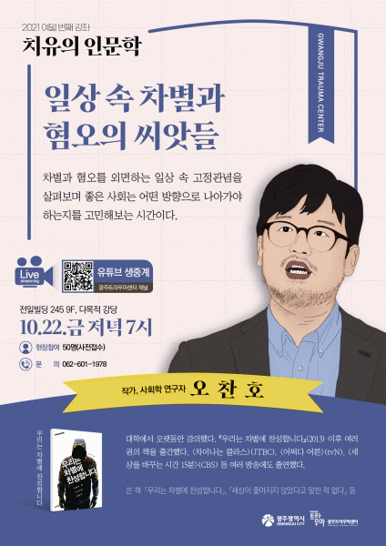 [¹Ìµð¾îÀü³² Á¦°¥´ëÁ¾ ±âÀÚ] ±¤ÁÖÆ®¶ó¿ì¸¶¼¾ÅÍ´Â 22ÀÏ ¿ÀÈÄ 7½Ã ÀüÀϺôµù245 9Ãþ ´Ù¸ñÀû°´ç¿¡¼ 10¿ù Ä¡À¯ÀÇ Àι®ÇÐÀ» °³ÃÖÇÑ´Ù. À̹ø °¿¬Àº ¿ÀÂùÈ£ ÀÛ°¡¿Í ¡®ÀÏ»ó ¼Ó Â÷º°°ú Çø¿ÀÀÇ ¾¾¾Ñµé¡¯À̶ó´Â ÁÖÁ¦·Î ¿ì¸® »çȸ¿¡ ±í¼÷ÀÌ ÀÚ¸® À⡦