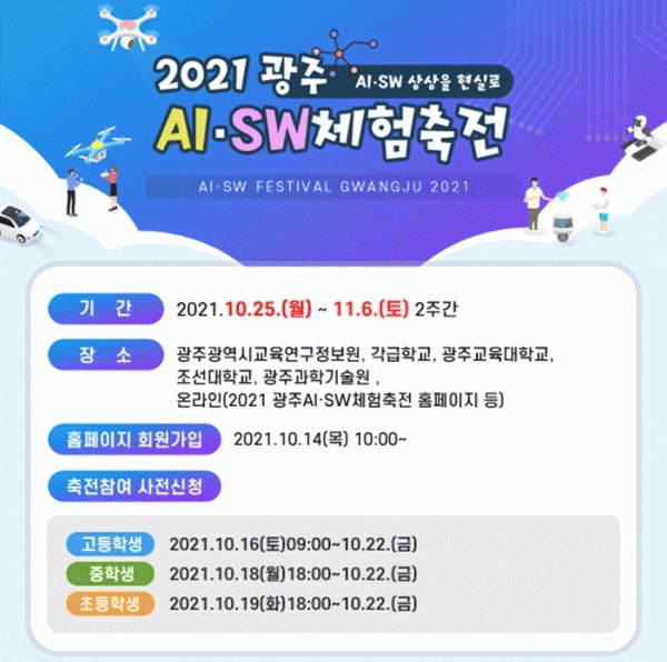 [¹Ìµð¾îÀü³² Á¦°¥´ëÁ¾ ±âÀÚ] ±¤ÁÖ±³À°¿¬±¸Á¤º¸¿øÀÌ ¿À´Â 25ÀÏ~11¿ù6ÀÏ 2ÁÖ µ¿¾È ÀΰøÁö´É½Ã´ë AI¡¤SW±³À° È®»êÀ» À§ÇÑ ¡®2021 ±¤ÁÖ AI¡¤SWüÇèÃàÀü¡¯À» °³ÃÖÇÑ´Ù. 18ÀÏ ±¤ÁÖ±³À°¿¬±¸Á¤º¸¿ø¿¡ µû¸£¸é À̹ø ÃàÀüÀº Äڷγª19 ¹æ¿ªÁöħ Áؼö¡¦