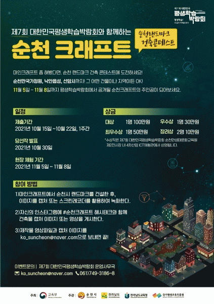 [¹Ìµð¾îÀü³² ÀÓ¼º¿Ï ±âÀÚ] ¼øÃµ½Ã´Â ¿À´Â 22ÀϱîÁö °ÔÀÓ ¸¶ÀÎÅ©·¡ÇÁÆ®¸¦ Ȱ¿ëÇÑ ¼øÃµ ·£µå¸¶Å© °ÇÃà ÄÜÅ×½ºÆ® ¡®¼øÃµÅ©·¡ÇÁÆ®¡¯ ÀÛǰÀ» °ø¸ðÇÑ´Ù. ½Ã´Â ¿À´Â 11¿ù °³ÃֵǴ Á¦7ȸ ´ëÇѹα¹ Æò»ýÇнÀ¹Ú¶÷ȸÀÇ ¿¬°èÇà»ç·Î °ÔÀÓ¡¤ITµµ Æò»ý¡¦