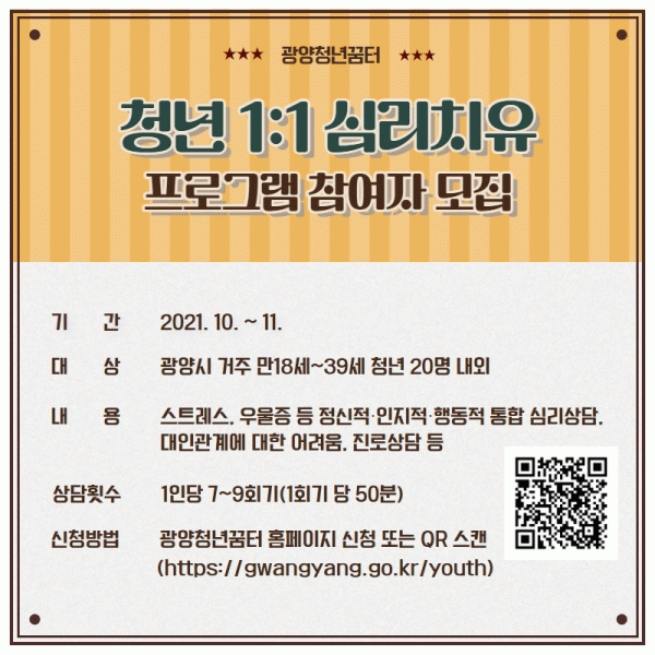 [¹Ìµð¾îÀü³² ÀÓ¼º¿Ï ±âÀÚ] ±¤¾ç½Ã´Â û³âµéÀÇ ¸¶À½ °Ç°À» À§ÇØ 1:1 ½É¸®Ä¡À¯ ÇÁ·Î±×·¥À» ÁøÇàÇϰí ÀÖ´Ù. ¡®Ã»³â ½É¸®»ó´ã ÇÁ·Î±×·¥¡¯Àº °æ±â ºÒȲ, ´ëÀΰü°è µî ´Ù¾çÇÑ ¹®Á¦·Î ÀÎÇÑ Ã»³âÀÇ ¹«±â·Â°¨°ú ¿ì¿ïÁõÀ» ÇØ¼ÒÇÏ°í ½É¸® ¼ºÀåÀ» µµ¡¦