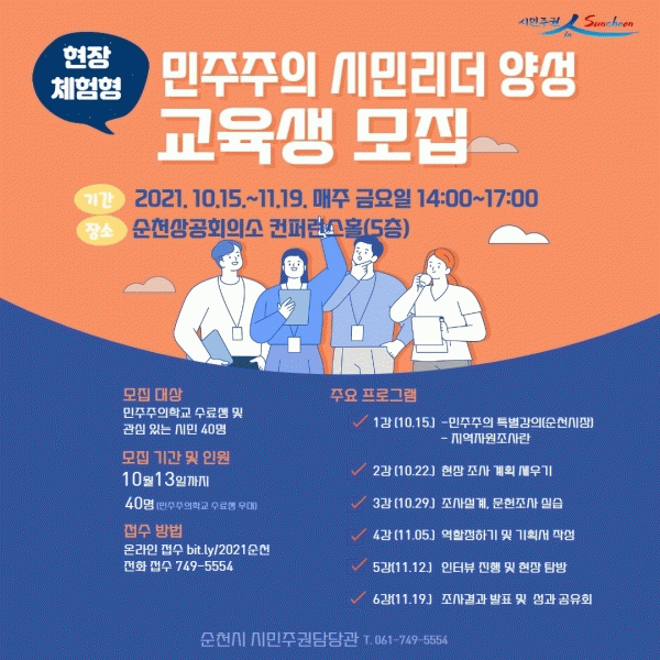 [¹Ìµð¾îÀü³² ÀÓ¼º¿Ï ±âÀÚ] ¼øÃµ½Ã´Â ¿À´Â 13ÀϱîÁö ¡®Á÷Á¢¹ÎÁÖÁÖÀÇ ½Ã¹Î¸®´õ ¾ç¼º±³À°¡¯¿¡ Âü¿©ÇÒ ±³À°»ý 40¸íÀ» ¸ðÁýÇÑ´Ù. À̹ø ±³À°Àº 10¿ù 15ÀϺÎÅÍ 11¿ù 19ÀϱîÁö ¸ÅÁÖ ±Ý¿äÀÏ ¿ÀÈÄ 3½Ã¿¡ ¼øÃµ»ó°øÈ¸ÀÇ¼Ò ÄÁÆÛ·±½ºÈ¦¿¡¼ ÀÏ»ó»ýȰ ¡¦