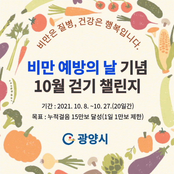 [¹Ìµð¾îÀü³² ÀÓ¼º¿Ï ±âÀÚ] ±¤¾ç½Ã°¡ 2021³â ºñ¸¸ ¿¹¹æÀÇ ³¯À» ±â³äÇØ ºñ¸¸ ¿¹¹æ°ú °ü¸®ÀÇ Á߿伺À» ³Î¸® ¾Ë¸®°í »ýȰ ¼Ó °È±â½Çõ ºÐÀ§±â Á¶¼ºÀ» À§ÇØ ¡®¿öÅ©¿Â 10¿ù °È±â 縰Áö¡¯¸¦ ¿î¿µÇÑ´Ù. ºñ¸¸Àº »îÀÇ ÁúÀ» Å©°Ô ¶³¾î¶ß¸®°í ½ÉÀ塦