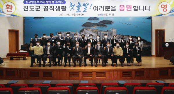 [¹Ìµð¾îÀü³² Á¦°¥´ëÁ¾ ±âÀÚ] Áøµµ±ºÀÌ 2021³â Áö¹æ °ø¹«¿ø ÀÓ¿ë½ÃÇè ÇÕ°ÝÀÚ 18¸í¿¡ ´ëÇØ ¡®½Å±Ô °ø¹«¿ø ¹ß·ÉÀå ¼ö¿©½Ä¡¯À» ±ºÃ» ´ëȸÀǽǿ¡ ÃÖ±Ù °³ÃÖÇß´Ù°í ¹àÇû´Ù. À̳¯ ¼ö¿©½ÄÀº Äڷγª19 °¨¿° ¿¹¹æÀ» À§ÇØ ¹ß¿ üũ, ¸¶½ºÅ© Âø¿ë µî¡¦