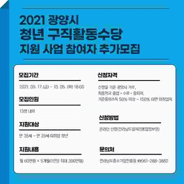 [¹Ìµð¾îÀü³² ÀÓ¼º¿Ï ±âÀÚ] ±¤¾ç½Ã´Â ¿À´Â 10¿ù 5ÀϱîÁö û³â ±¸Á÷Ȱµ¿¼ö´ç Áö¿ø»ç¾÷ÀÇ Âü¿©ÀÚ¸¦ Ãß°¡ ¸ðÁýÇÑ´Ù. ±¤¾ç û³â ±¸Á÷Ȱµ¿¼ö´ç Áö¿ø»ç¾÷Àº ±¸Á÷Ȱµ¿¿¡ ÇÊ¿äÇÑ ÃÖ¼ÒÇÑÀÇ °æºñ Áö¿øÀ¸·Î Ãë¾÷ ÀÇ¿åÀ» °íÃëÇÏ°í ³ëµ¿½ÃÀå Á¶±â ÁøÀÔ¡¦