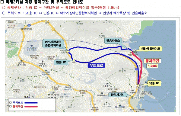 [¹Ìµð¾îÀü³² ÀüÇü¼º ±âÀÚ] ¿©¼ö½Ã°¡ ¸¶·¡2ÅͳΠ³»ºÎ ³«¼® À§Çè¼® Á¦°Å ¹× º¸¼ö¸¦ À§ÇØ ¿À´Â 9¿ù 29ÀÏ 09:00ºÎÅÍ 10¿ù 8ÀÏ ¿ÀÈÄ 6½Ã±îÁö Â÷·® ¹× º¸ÇàÀÚ ÅëÇàÀ» ÅëÁ¦ÇÑ´Ù. ±Ý¹ø ÅëÁ¦´Â ¿Ã »ó¹Ý±â ½Ç½ÃÇß´ø ¸¶·¡2ÅͳΠƯº°Á¡°Ë °á°ú¿¡ µû¶ó¡¦