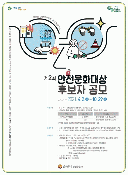 [¹Ìµð¾îÀü³² ÀÓ¼º¿Ï ±âÀÚ] ¼øÃµ½Ã´Â ¡®Á¦2ȸ ¼øÃµ½Ã ¾ÈÀü¹®È´ë»ó¡¯Èĺ¸ÀÚ¸¦ °ø°³ ¸ðÁýÇÑ´Ù. ¼øÃµ½Ã ¾ÈÀü¹®È´ë»óÀº Àç³ÀÇ ¿¹¹æ, ´ëºñ, ´ëÀÀ, º¹±¸ µî Àç³°ü¸®¿Í ¾ÈÀü¹®È È®»ê¿¡ Èû¾´ °³Àΰú ´Üü¿¡ ¼ö¿©ÇÏ´Â »óÀ¸·Î Áö³ÇØ Ã¹ ½Ã»óÁ¦¡¦