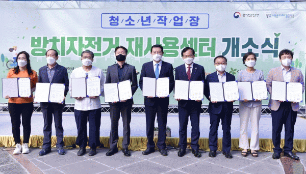 [¹Ìµð¾îÀü³² Á¦°¥´ëÁ¾ ±âÀÚ] ¹æÄ¡ÀÚÀü°Å ¹®Á¦ ÇØ°á°ú ÀÚÀü°Å º¸±Þ Ȱ¼ºÈ¸¦ À§ÇÑ ¡®¹æÄ¡ÀÚÀü°Å Àç»ç¿ë¼¾ÅÍ¡¯ °³¼Ò½Ä ¹× ¼¾ÅÍ È°¼ºÈ¸¦ À§ÇÑ Çù¾à½ÄÀÌ 23ÀÏ ¿ÀÈÄ ±¤»ê±¸ ¾ÚÄÚ·Î ÇöÀå¿¡¼ ¿·È´Ù. À̳¯ °³¼Ò½Ä ¹× Çù¾à½ÄÀº ¹æÄ¡µÈ ÀÚÀü°Å·Î¡¦
