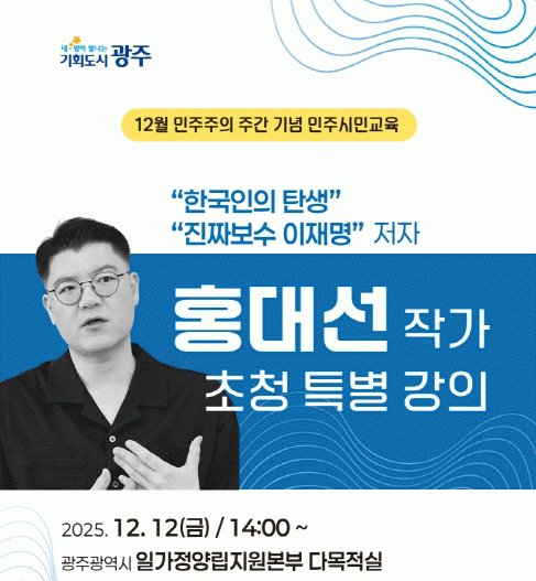 [¹Ìµð¾îÀü³² Á¦°¥´ëÁ¾ ±âÀÚ]±¤ÁÖ±¤¿ª½Ã´Â ¡®¹ÎÁÖÁÖÀÇ ÁÖ°£¡¯ ¸¶Áö¸· ³¯ÀÎ 12ÀÏ ¿ÀÈÄ 2½Ã Àϰ¡Á¤¾ç¸³º»ºÎ ´Ù¸ñÀû½Ç¿¡¼ È«´ë¼± Àι®ÀÛ°¡ ÃÊû Ưº°°¿¬À» ¿¬´Ù. È«´ë¼± ÀÛ°¡´Â ¡®Çѱ¹ÀÎÀÇ ÅõÀï¹ý°ú ¹ÎÁÖÁÖÀÇ¡¯¸¦ ÁÖÁ¦·Î Çѱ¹ÀÎÀÌ ºÎ´çÇÔ¡¤¡¦