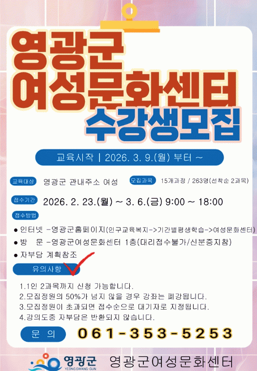 [¹Ìµð¾îÀü³² Á¦°¥´ëÁ¾ ±âÀÚ]¿µ±¤±º ¿©¼º¹®È¼¾ÅÍ´Â '2026³â »ó¹Ý±â ¿©¼º¹®È¼¾ÅÍ ÇÁ·Î±×·¥' ¼ö°»ýÀ» ¸ðÁýÇÑ´Ù°í ¹àÇû´Ù. À̹ø »ó¹Ý±â ÇÁ·Î±×·¥Àº ÃÖ±Ù ¿Ï·áµÈ ¿©¼º¹®È¼¾ÅÍ ¸®¸ðµ¨¸µ ÀÌÈÄ Ã³À½ ¿î¿µµÇ´Â °úÁ¤À¸·Î, ÇÑÃþ ´õ ÄèÀûÇØÁø ±³¡¦
