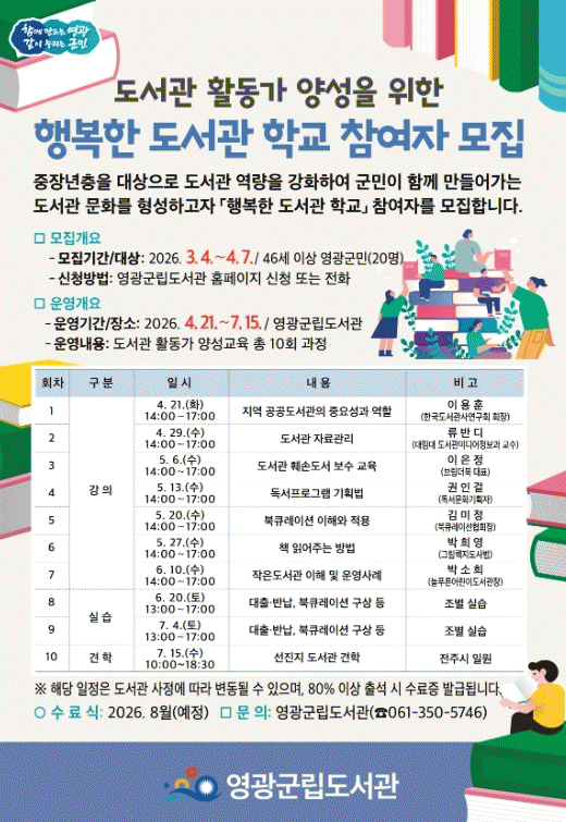 [¹Ìµð¾îÀü³² Á¦°¥´ëÁ¾ ±âÀÚ]¿µ±¤±ºÀº Áö¿ª µ¶¼¹®È Ȱ¼ºÈ¿Í ±º¹Î Âü¿©Çü µµ¼°ü ¿î¿µ ±â¹ÝÀ» ¸¶·ÃÇϱâ À§ÇØ 'ÇູÇÑ µµ¼°ü Çб³' Âü¿©ÀÚ¸¦ ¸ðÁýÇÑ´Ù°í ¹àÇû´Ù. À̹ø »ç¾÷Àº °ü³» ÁßÀå³âÃþÀ» ´ë»óÀ¸·Î µµ¼°üÀÇ ¿ªÇÒ°ú ±â´ÉÀ» ÀÌÇØÇÏ°í¡¦