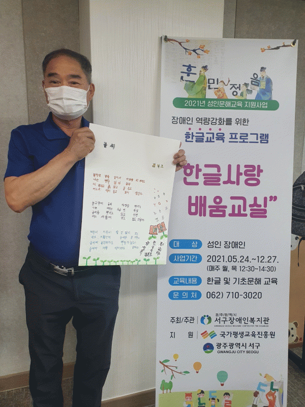 [¹Ìµð¾îÀü³² ±èÁ¤¿ì ±âÀÚ] ±¤ÁÖ±¤¿ª½Ã ¼±¸°¡ Áö¿øÇÏ´Â Àå¾ÖÀκ¹Áö°ü¿¡¼ ¹®Çر³À°À» ¹Þ°í ÀÖ´Â ÇнÀÀÚ°¡ ±³À°ºÎ¿Í ±¹°¡Æò»ý±³À°ÁøÈï¿ø¿¡¼ ÁÖ°üÇϴ¡®Àü±¹ ¼ºÀι®Çر³À° ½ÃÈÀü¡¯¿ì¼ö»óÀ» ¹Þ¾Æ ÈÁ¦´Ù. ±× ÁÖÀΰøÀº ¡°±Û¾¾¡±¶ó´Â ÁÖÁ¦·Î¡¦
