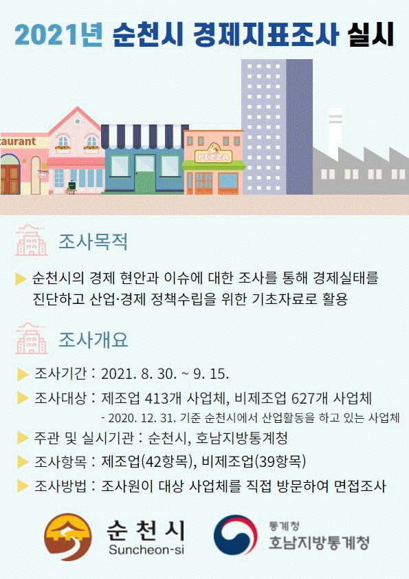 [¹Ìµð¾îÀü³² ÀÓ¼º¿Ï ±âÀÚ] ¼øÃµ½Ã´Â È£³²Áö¹æÅë°èû°ú Çù·ÂÇØ ¿À´Â 8¿ù 30ÀϺÎÅÍ 9¿ù 15ÀϱîÁö ¡®2021³â ¼øÃµ½Ã °æÁ¦ÁöÇ¥Á¶»ç¡¯¸¦ ½Ç½ÃÇÑ´Ù. ¡®2021³â ¼øÃµ½Ã °æÁ¦ÁöÇ¥Á¶»ç¡¯´Â ¼øÃµ½Ã ¼ÒÀç »ç¾÷üÀÇ °æ¿µÈ¯°æ°ú »ç¾÷ Ȱµ¿ ¿©°Ç µîÀ» Á¶¡¦