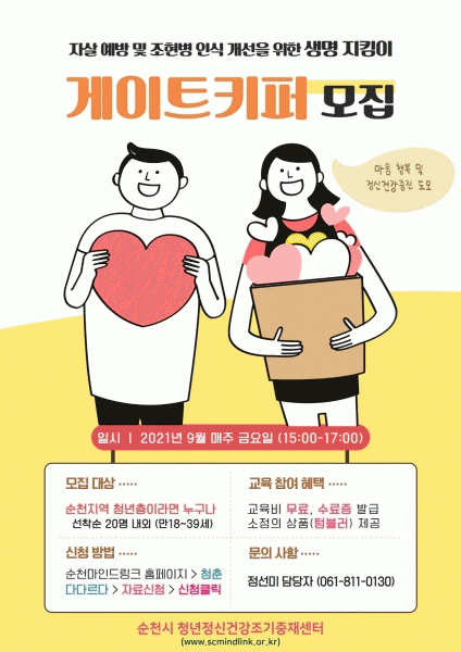 [¹Ìµð¾îÀü³² ÀÓ¼º¿Ï ±âÀÚ] ¼øÃµ½Ã°¡ Á¤½Å°Ç° Áö¿ª»çȸ ¾ÈÀü¸Á ±¸ÃàÀ» À§ÇØ Ã»³âÃþ »ý¸í»ç¶ûÁöÅ´ÀÌ ¾ç¼º¿¡ ³ª¼±´Ù. ¼øÃµ¸¶Àε帵ũ´Â ¸¸18¼¼ºÎÅÍ 39¼¼ÀÇ Ã»³âÀ» ´ë»óÀ¸·Î »ý¸í»ç¶ûÁöÅ´ÀÌ ¡®°ÔÀÌÆ®Å°ÆÛ¡¯¾ç¼º ±³À° Âü°¡ÀÚ¸¦ 12¿ù ¸»±îÁö ¡¦