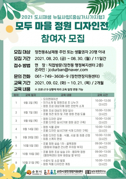 [¹Ìµð¾îÀü³² ÀÓ¼º¿Ï ±âÀÚ] ¼øÃµ½Ã´Â Àåõµ¿ Á¾ÇÕ¹ö½ºÅ͹̳ΠÀÏ¿ø µµ½ÃÀç»ý Ȱ¼ºÈ »ç¾÷Áö¿ªÀÇ Á¤¿ø¹®È Ȱ¼ºÈ¸¦ À§ÇØ ¿À´Â 10¿ù °³ÃÖ¿¹Á¤ÀÎ ¡®2021 Á¤¿ø ÀÛǰ µðÀÚÀÎÀü¡¯ Âü¿©ÀÚ¸¦ ¸ðÁýÇÑ´Ù. ¡®2021 Á¤¿ø ÀÛǰ µðÀÚÀÎÀü¡¯Àº Á¤¿ø Á¶¼º ¡¦