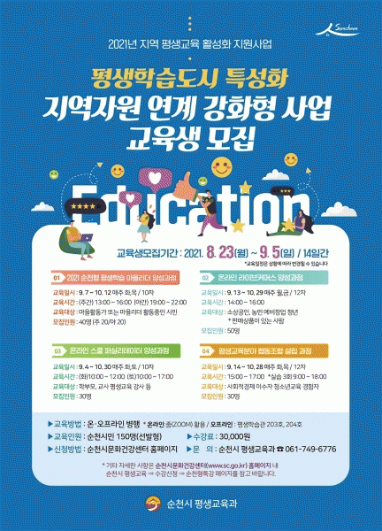 [¹Ìµð¾îÀü³² ÀÓ¼º¿Ï ±âÀÚ] ¼øÃµ½Ã´Â Æò»ýÇнÀµµ½Ã Ư¼ºÈ¸¦ À§ÇØ Áö¿ªÀÚ¿ø ¿¬°è °ÈÇü »ç¾÷¿¡ Âü¿©ÇÒ ±³À°»ýÀ» ¿À´Â 9¿ù 5ÀϱîÁöÁö °ø°³ ¸ðÁýÇÑ´Ù. ±³À°ºÎ ÁÖ°ü ¡®2021³â Áö¿ª Æò»ý±³À° Ȱ¼ºÈ Áö¿ø»ç¾÷¡¯°ø¸ð¿¡ ¼±Á¤µÈ ¼øÃµ½Ã´Â ¸¶À» ¡¦