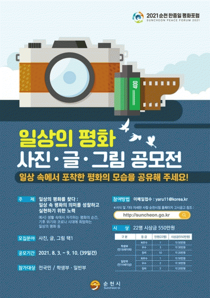 [¹Ìµð¾îÀü³² ÀÓ¼º¿Ï ±âÀÚ] ¼øÃµ½Ã°¡ ¿À´Â 10¿ù¿¡ °³ÃÖÇÏ´Â ¡®2021 ¼øÃµ ÇÑÁßÀÏ ÆòÈÆ÷·³¡¯À» ±â³äÇØ Àü ±¹¹ÎÀ» ´ë»óÀ¸·Î ¡®ÀÏ»óÀÇ ÆòÈ¡¯¸¦ ÁÖÁ¦·Î °ø¸ðÀüÀ» °³ÃÖÇÑ´Ù. À̹ø °ø¸ðÀüÀº ¡®ÀÏ»óÀÇ Æòȸ¦ ã´Ù : ÀÏ»ó ¼Ó ÆòÈÀÇ Àǹ̸¦ ¼º¡¦