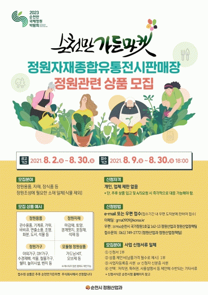 [¹Ìµð¾îÀü³² ÀÓ¼º¿Ï ±âÀÚ] ¼øÃµ½Ã´Â Á¤¿ø»ê¾÷ À°¼º¡¤º¸±Þ°ú Á¤¿ø¹®È Ȱ¼ºÈ¸¦ À§ÇØ ¿À´Â 10¿ù °³¼ÒÇÏ´Â ¼øÃµ¸¸°¡µç¸¶ÄÏ¿¡¼ Àü½Ã¡¤ÆÇ¸ÅÇÒ Ã¢ÀÇÀûÀÌ°í ±â´ÉÀûÀÎ Á¤¿ø°ü·Ã »óǰÀ» ¸ðÁýÇÑ´Ù. À̹ø¿¡ °ø°³¸ðÁýÇÏ´Â Á¤¿ø°ü·Ã »óǰÀº Á¤¿ø¿ëǰ¡¦
