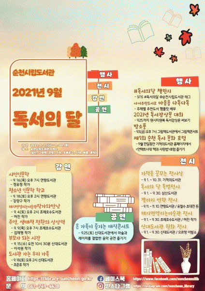 [¹Ìµð¾îÀü³² ÀÓ¼º¿Ï ±âÀÚ] ¼øÃµ½Ã´Â ¿À´Â 9¿ù µ¶¼ÀÇ ´ÞÀ» ¸ÂÀÌÇØ ½Ã¹ÎµéÀÌ Ã¥°ú ÇÑÃþ ´õ °¡±î¿ö Áú ¼ö ÀÖµµ·Ï ´Ù¾çÇÑ µ¶¼ À̺¥Æ®¿Í °¿¬, Àü½Ã, °ø¿¬À» ¸¶·ÃÇÑ´Ù. À̹ø µ¶¼ÀÇ ´Þ ÇÁ·Î±×·¥Àº ¼øÃµ½Ã¸³µµ¼°ü 8°÷¿¡¼ ºñ´ë¸é µ¶¼ Ä·Æä¡¦