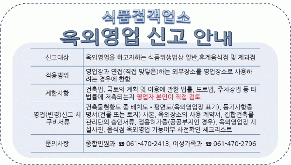 [¹Ìµð¾îÀü³² ±è±âö ±âÀÚ] ¿µ¾Ï±ºÀº ¿Á¿Ü¿µ¾÷À» ÇϰíÀÚ ÇÏ´Â ÀϹÝÀ½½ÄÁ¡, ÈÞ°ÔÀ½½ÄÁ¡, Á¦°úÁ¡ ¿µ¾÷ÀÚ¸¦ ´ë»óÀ¸·Î ¿ÃÇØ 12¿ù±îÁö ¿Á¿Ü¿µ¾÷ º¯°æ½Å°í Á¢¼ö ±â°£À» ¿î¿µÇÑ´Ù°í ¹àÇû´Ù. ¿ÃÇØ 1¿ùºÎÅÍ¡®½ÄǰÀ§»ý¹ý ½ÃÇà±ÔÄ¢¡¯ÀÌ °³Á¤µÇ¸é¼ ¡¦