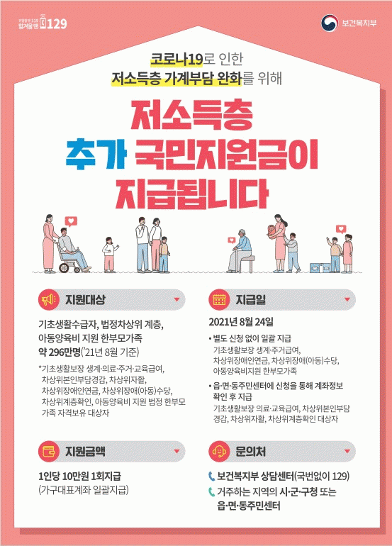 [¹Ìµð¾îÀü³² Á¦°¥´ëÁ¾ ±âÀÚ] ȼø±ºÀÌ Äڷγª19·Î »ý°è°¡ ¾î·Á¿öÁø Àú¼ÒµæÃþ 4746¸í¿¡°Ô 1Àδç 10¸¸¿øÀÇ Àú¼ÒµæÃþ Ãß°¡ ±¹¹ÎÁö¿ø±ÝÀ» Áö±ÞÇÑ´Ù. Àú¼ÒµæÃþ Ãß°¡ ±¹¹ÎÁö¿ø±ÝÀº 5Â÷ Àç³Áö¿ø±Ý°ú´Â º°µµ·Î Áö±ÞµÈ´Ù. Áö¿ø´ë»óÀº ¿ÃÇØ 8¿ù ¡¦