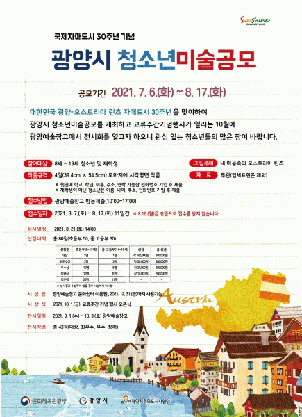 [¹Ìµð¾îÀü³² ÀÓ¼º¿Ï ±âÀÚ] ±¤¾ç½Ã´Â ´ëÇѹα¹ ±¤¾ç-¿À½ºÆ®¸®¾Æ ¸°Ã÷ Àڸŵµ½Ã 30ÁÖ³âÀ» ¸ÂÀÌÇØ ¡®³» ¸¶À½¼ÓÀÇ ¿À½ºÆ®¸®¾Æ ¸°Ã÷¡¯¶ó´Â ÁÖÁ¦·Î ¹Ì¼úÀÛǰ °ø¸ðÀüÀ» ÁøÇàÇÑ´Ù. À̹ø °ø¸ðÀüÀº 8~19¼¼ ±¤¾ç½Ã û¼Ò³âÀ» ´ë»óÀ¸·Î ÃʵîºÎ¿Í Áß¡¤¡¦