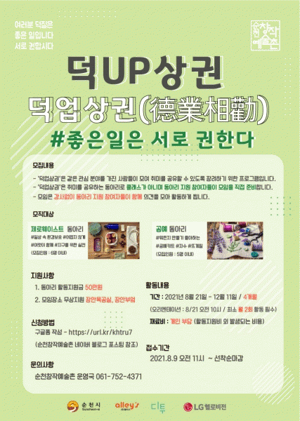 [¹Ìµð¾îÀü³² ÀÓ¼º¿Ï ±âÀÚ] ¼øÃµ âÀÛ¿¹¼úÃÌ ¡®Àå¾ÈâÀÛ¸¶´ç¡¯´Â ¿À´Â 8¿ù 9ÀϺÎÅÍ 2021³â À¶º¹ÇÕÇÁ·Î±×·¥ ¼Ò±Ô¸ð µ¿¾Æ¸® Áö¿ø ¡®´ö¾÷»ó±Ç¡¯ Âü¿©ÀÚ¸¦ ¸ðÁýÇÑ´Ù. ¡®´ö¾÷»ó±Ç¡¯Àº Çâ¾à 4´ë °¸ñ Áß Çϳª·Î ¡®ÁÁÀº °ÍÀº ¼·Î ±ÇÇÑ´Ù¡¯¶ó´Â ¡¦