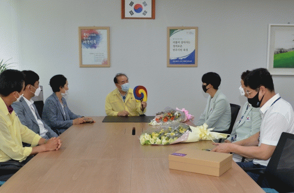 [¹Ìµð¾îÀü³² Á¦°¥´ëÁ¾ ±âÀÚ] ÀåÈÖ±¹ ±³À°°¨ÀÌ 3ÀÏ ¿ÀÈÄ 1½Ã ±¤Áֽñ³À°Ã»À» ¹æ¹®ÇÑ 2020 µµÄì¿Ã¸²ÇÈ ¡®¾ç±Ã 3°ü¿Õ¡¯ ¾È»ê ¼±¼ö¸¦ ȯ¿µÇß´Ù. ÀåÈÖ±¹ ±³À°°¨Àº ±³À°°¨½Ç¿¡¼ ¾È»ê ¼±¼ö ¹× ±¤ÁÖüÀ°°í ¾ç±Ã Áöµµ±³»ç ¼ÛÄ¥¼® ±¹°¡´ëÇ¥ ÄÚÄ¡ ¡¦