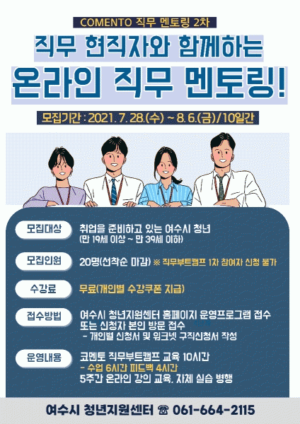 [¹Ìµð¾îÀü³² ÀüÇü¼º ±âÀÚ] ¿©¼ö½Ã´Â Á÷¹«°æÇèÀÌ ÇÊ¿äÇÑ Ã»³â ±¸Á÷ÀÚµéÀ» À§ÇØ ¡®¿Â¶óÀÎ Á÷¹« ¸àÅ丵[ÇöÁ÷ÀÚ Á÷¹«ºÎƮķÇÁ]¡¯ 2Â÷ Âü°¡ÀÚ¸¦ ¼±Âø¼ø ¸ðÁýÇÑ´Ù°í ¹àÇû´Ù. ¡®¿Â¶óÀÎ Á÷¹« ¸àÅ丵¡¯À̶õ 5ÁÖ µ¿¾È ÇöÁ÷ÀÚ¿Í ÇÔ²² ½Ç¹«°úÁ¦¸¦ ÇØ¡¦