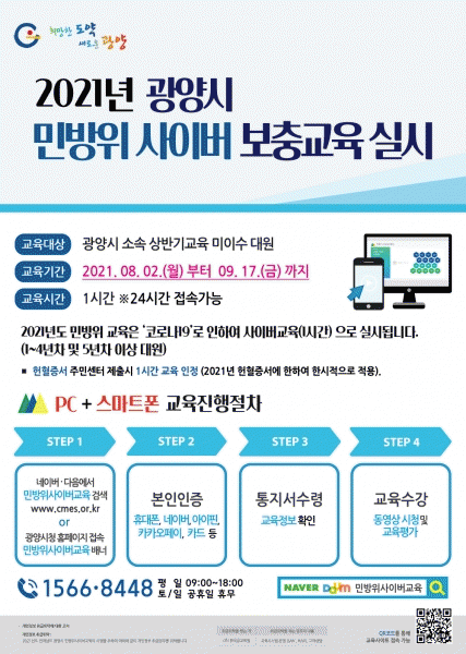 [¹Ìµð¾îÀü³² ÀÓ¼º¿Ï ±âÀÚ] ±¤¾ç½Ã´Â »ó¹Ý±â ¹Î¹æÀ§±³À° ¹ÌÀ̼ö ´ë¿øÀ» ´ë»óÀ¸·Î 8¿ù 2ÀÏ~9¿ù 17ÀÏ »çÀ̹ö±³À°À» ½Ç½ÃÇÑ´Ù. À̹ø¿¡ ½Ç½ÃÇÏ´Â ¹Î¹æÀ§ »çÀ̹ö±³À°Àº ±¤¾ç½Ã¿¡ ÁÖ¼Ò¸¦ µÐ Áö¿ª¡¤Á÷Àå¹Î¹æÀ§´ë¿øÀ» Æ÷ÇÔÇÑ Àü ´ë¿øÀ» ´ë»óÀ¸·Î ¡¦